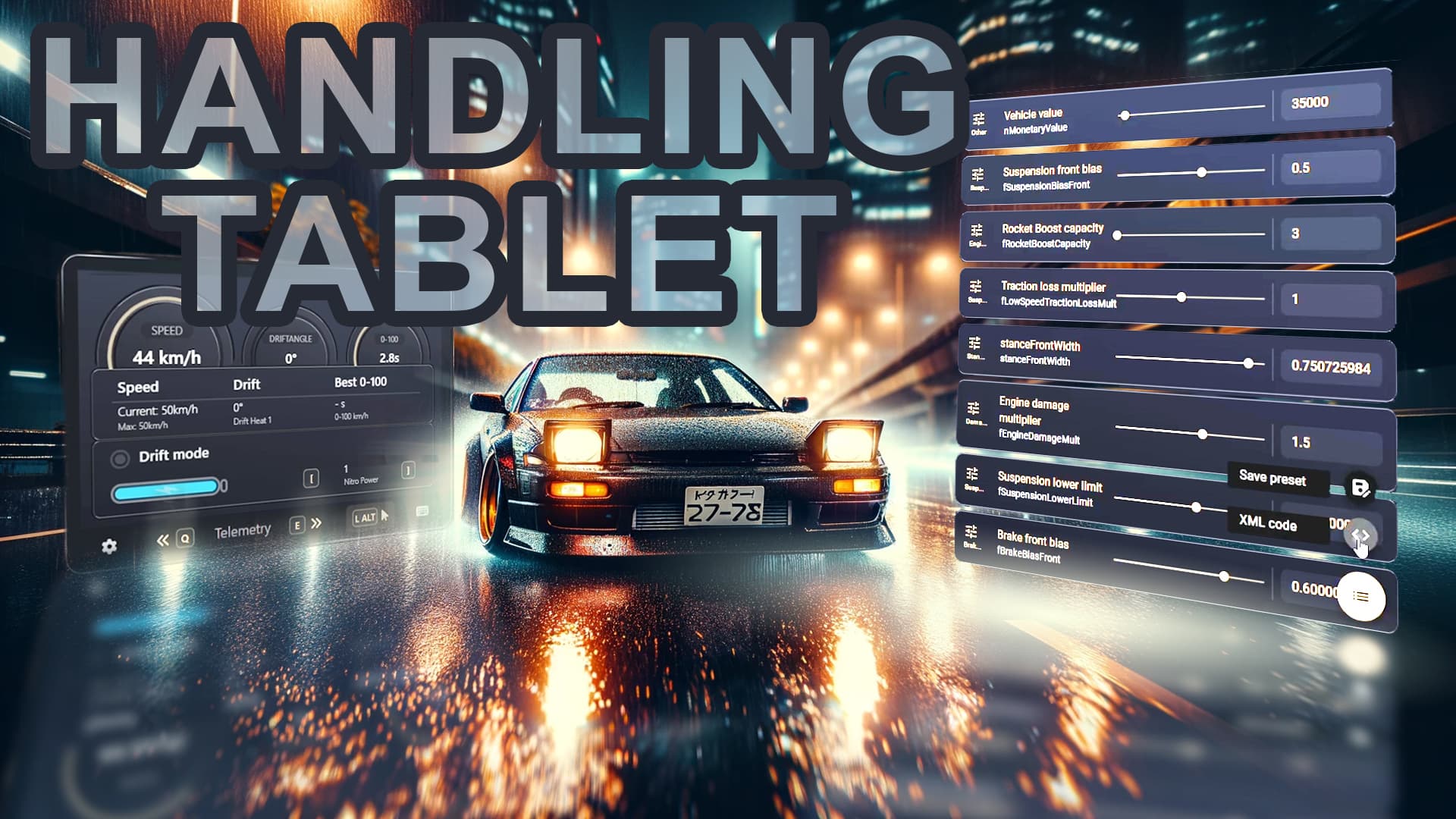 A handling tuning suite for FiveM with live diagnostics, drift mode, custom parts, and developer export tooling.